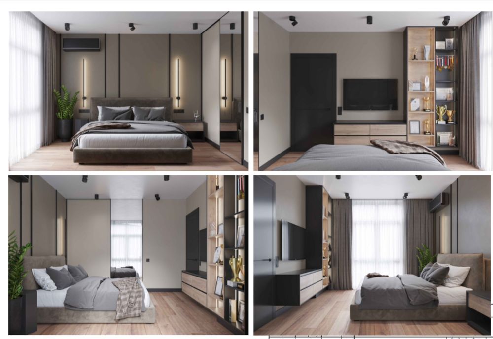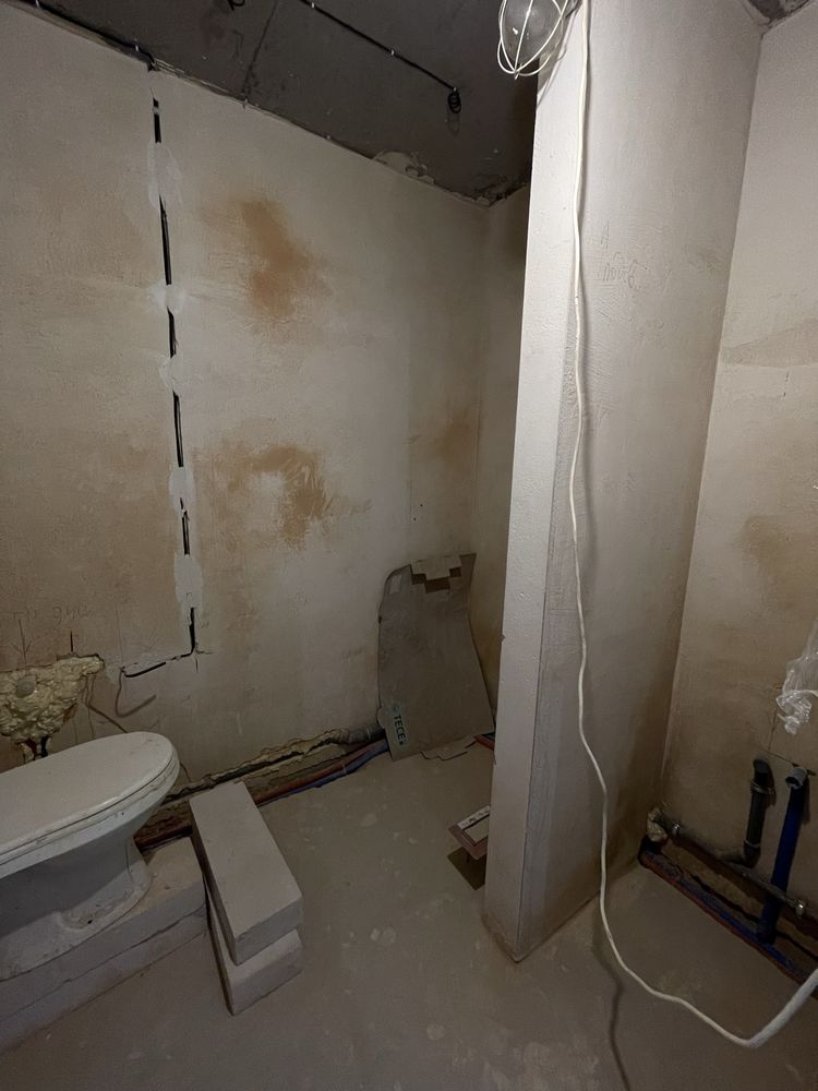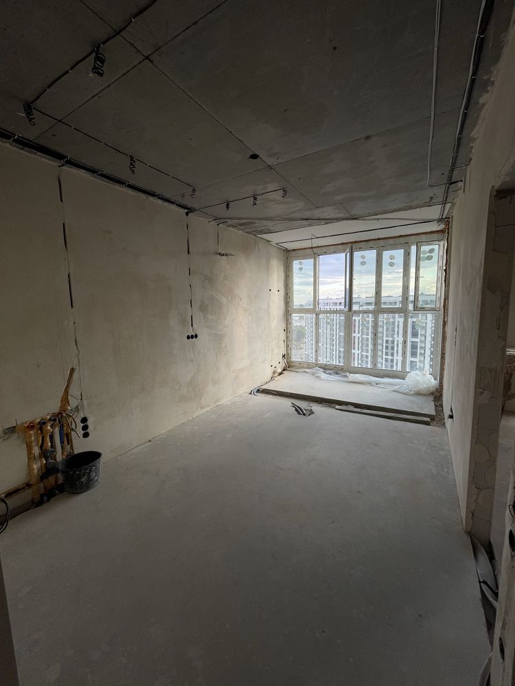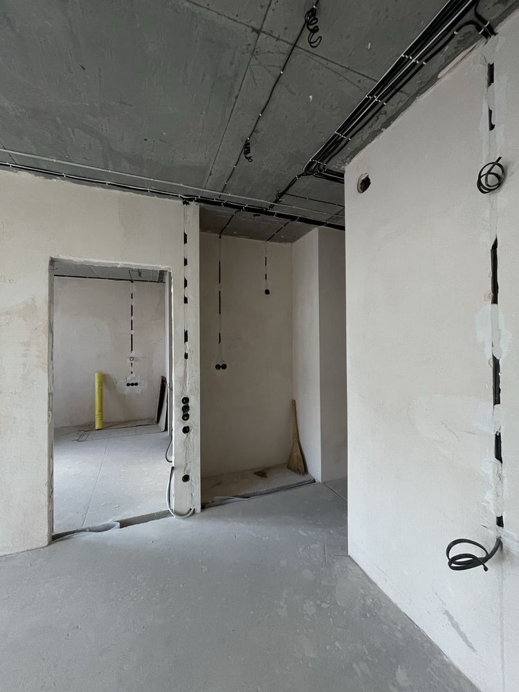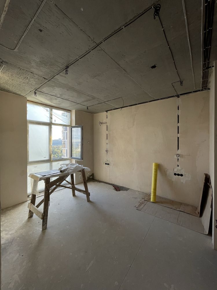 У помешканні вже реалізовано найскладніший етап: виконано перепланування згідно з професійним дизайн-проєктом та завершено всі чорнові роботи. Простір розділений на кухню-вітальню, окрему спальню, дві місткі гардеробні та санвузол із пральною зоною. Технічне оснащення виконано на найвищому рівні: прокладено нові електромережі з потужним щитом, сантехнічні комунікації та виводи під очищення води, бойлер і кондиціонери. Особливою окрасою стали замінені панорамні вікна в підлогу на лоджії, що забезпечують ідеальну шумоізоляцію та тепло. Проєкт передбачає витриману палітру в бежевих та графітових відтінках із текстурами теплого горіха та бетону, а також лінійне локальне освітлення, що підкреслює архітектурну естетику житла.