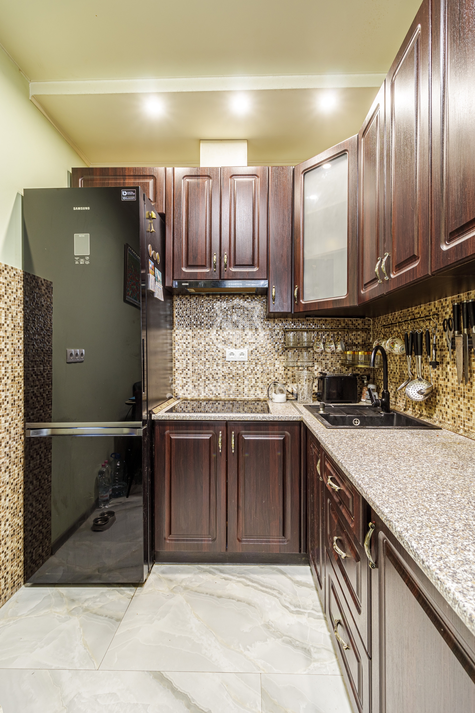 Квартира має кухню-вітальню площею 23 м², і спальню 13.7 м², санвузол, коридор 6,7 м² в середині квартири, сучасний ремонт в спокійних кольорах, частково залишаються меблі. Вбудована кухня, два кондиціонери, бойлер, душова кабіна також залишаться в квартирі.