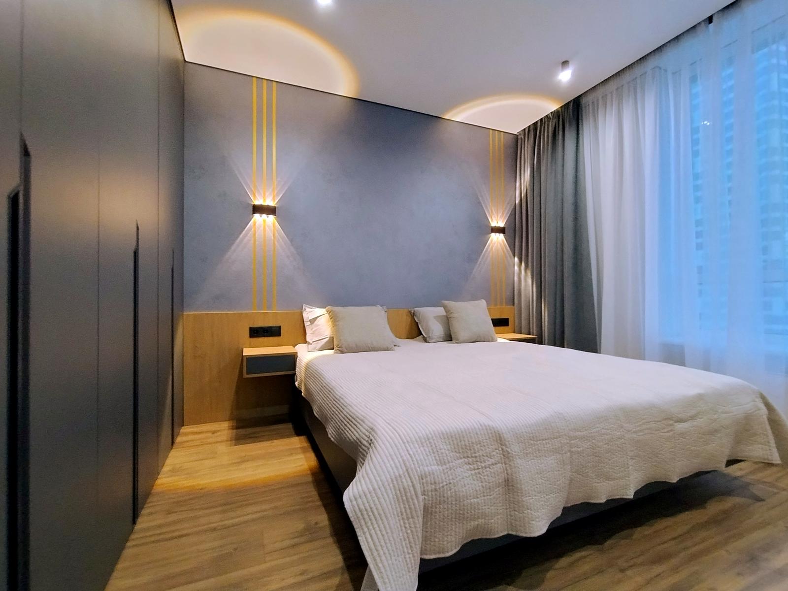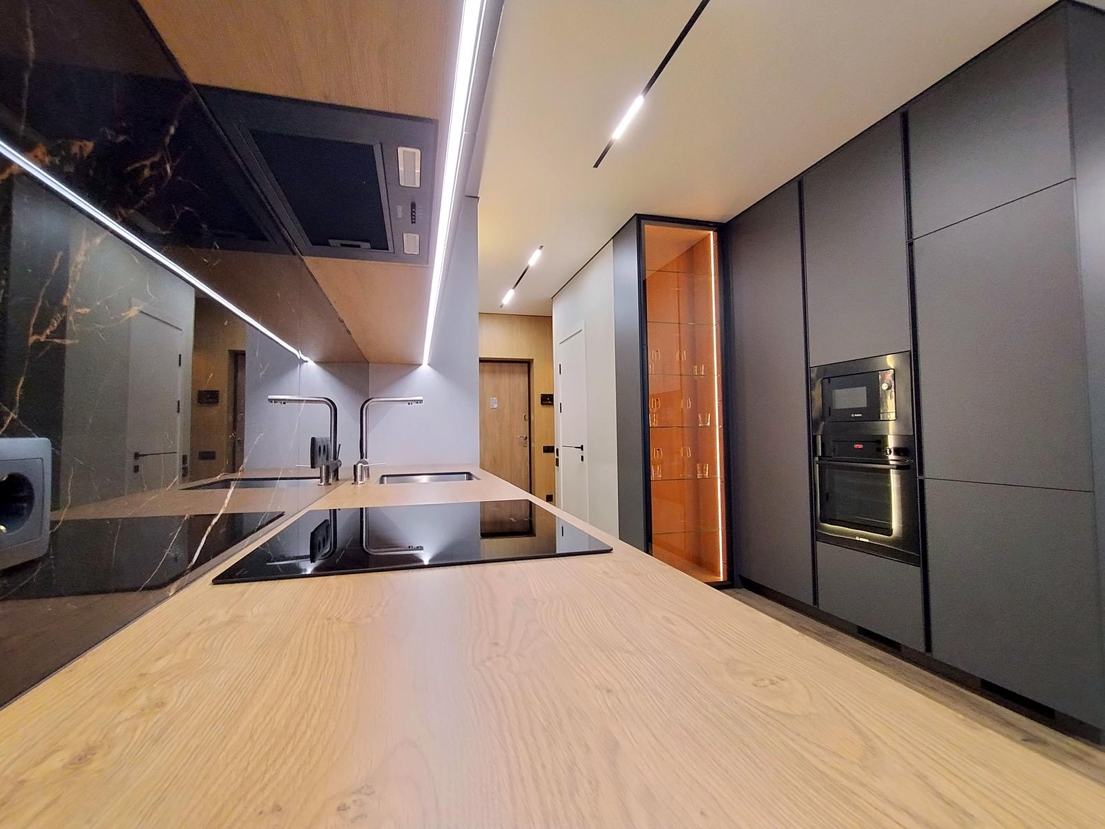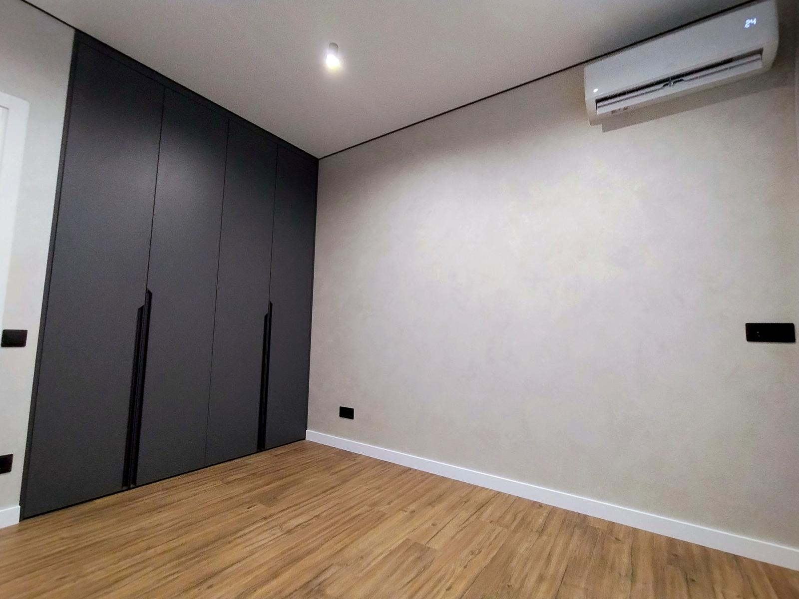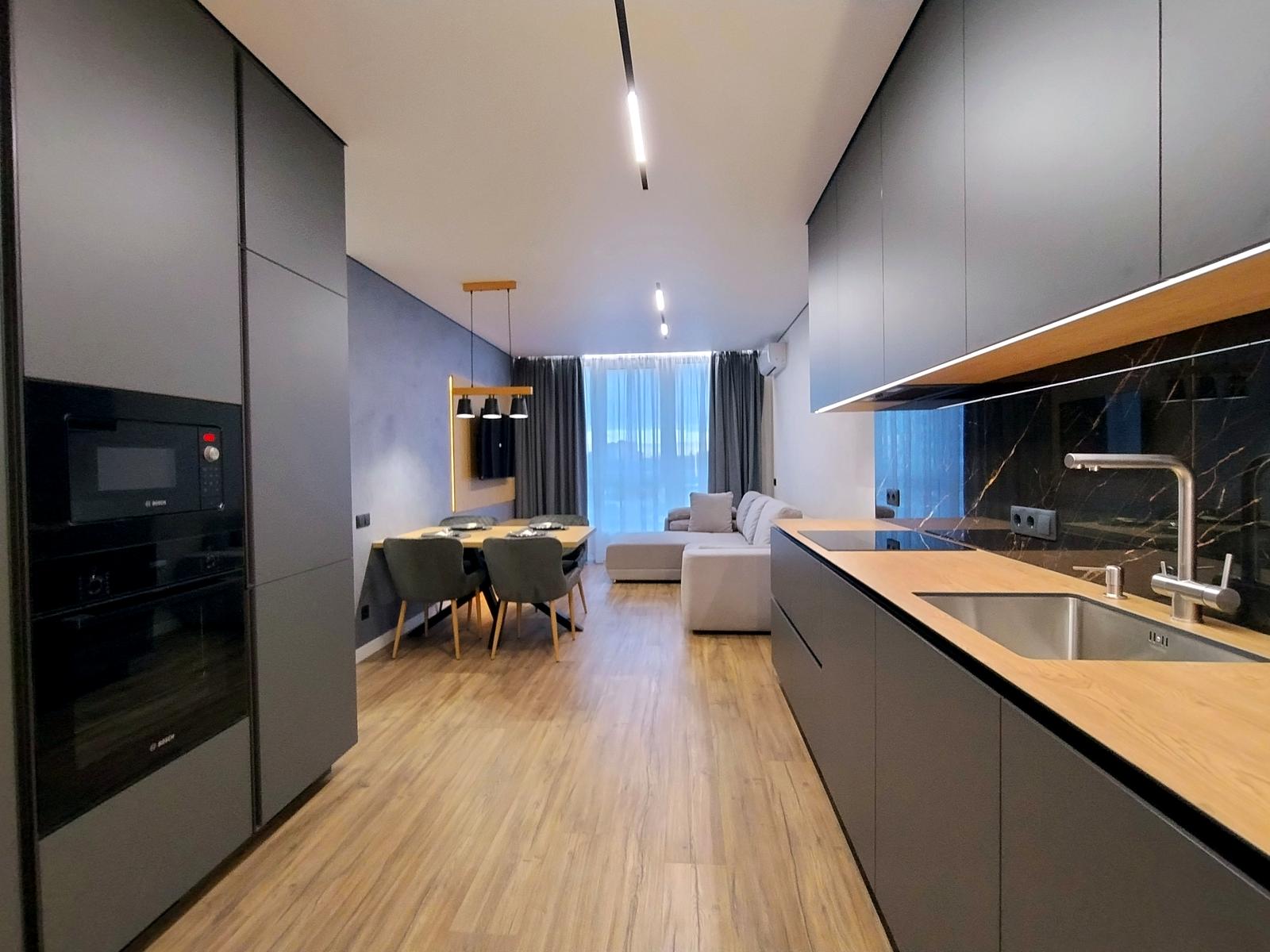 В оселі щойно завершено стильний дизайнерський ремонт 2026 року з використанням високоякісних матеріалів. Підлога встелена вологостійким ламінатом та керамічною плиткою, стіни оздоблені декоративною штукатуркою, а натяжна стеля доповнена сучасними світловими рішеннями: магнітним трековим освітленням у студії, точковим у кімнатах, а також декоративними підсвітками меблів і стелі з інтегрованою нічною підсвіткою на датчиках руху. Квартира повністю укомплектована вбудованими меблями з преміальною фурнітурою та всією необхідною побутовою технікою бренду BOSH, телевізором Samsung та чотирма кондиціонерами для кожної зони. Особливий комфорт забезпечують два повноцінні санвузли — один із ванною, а другий із душовою кабіною.