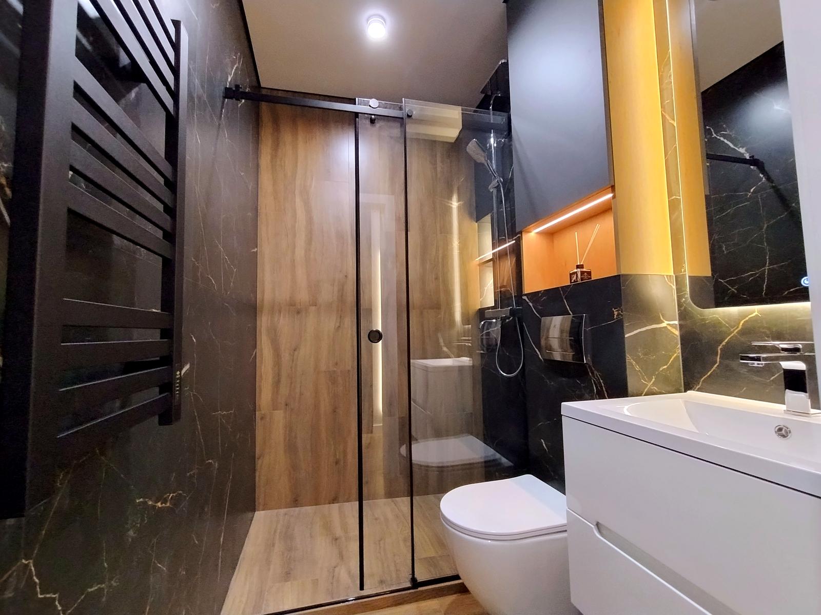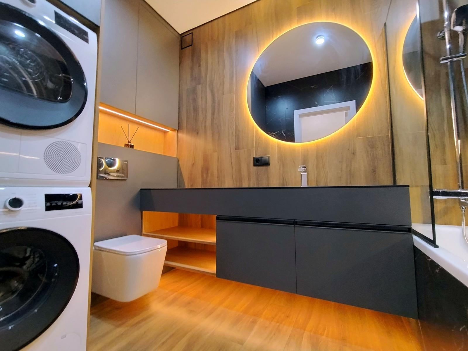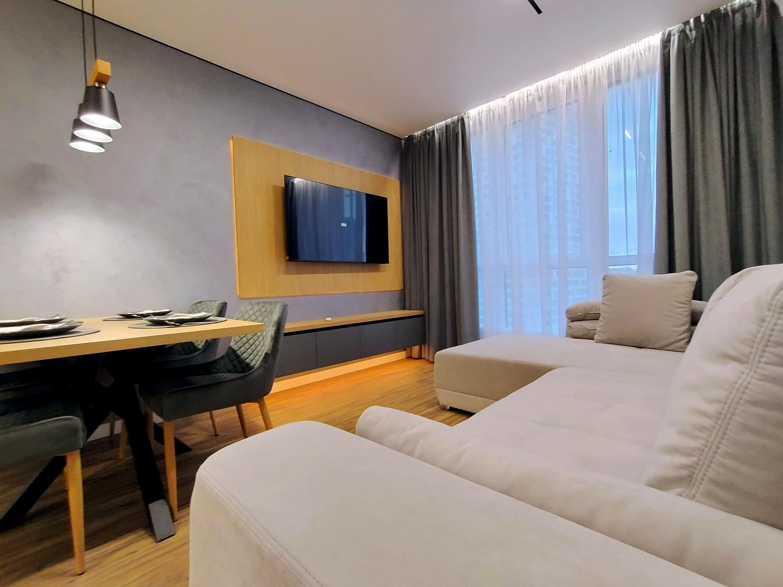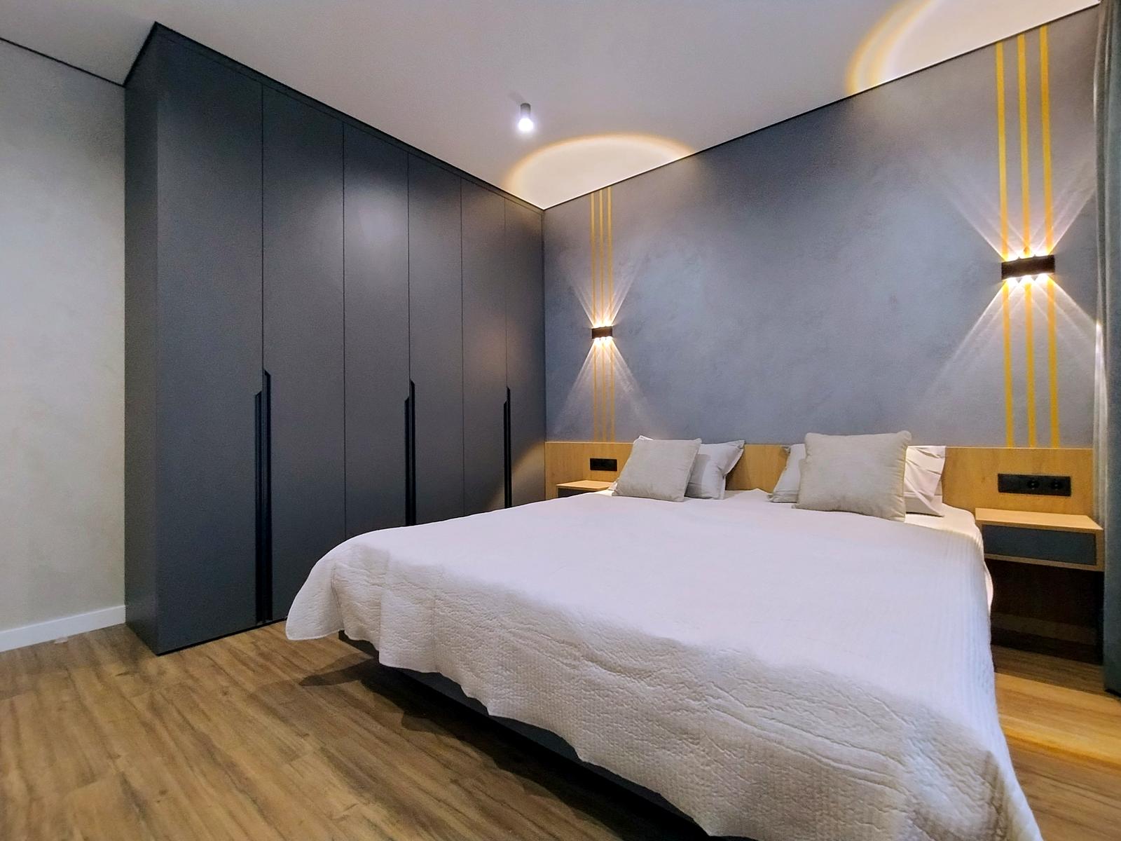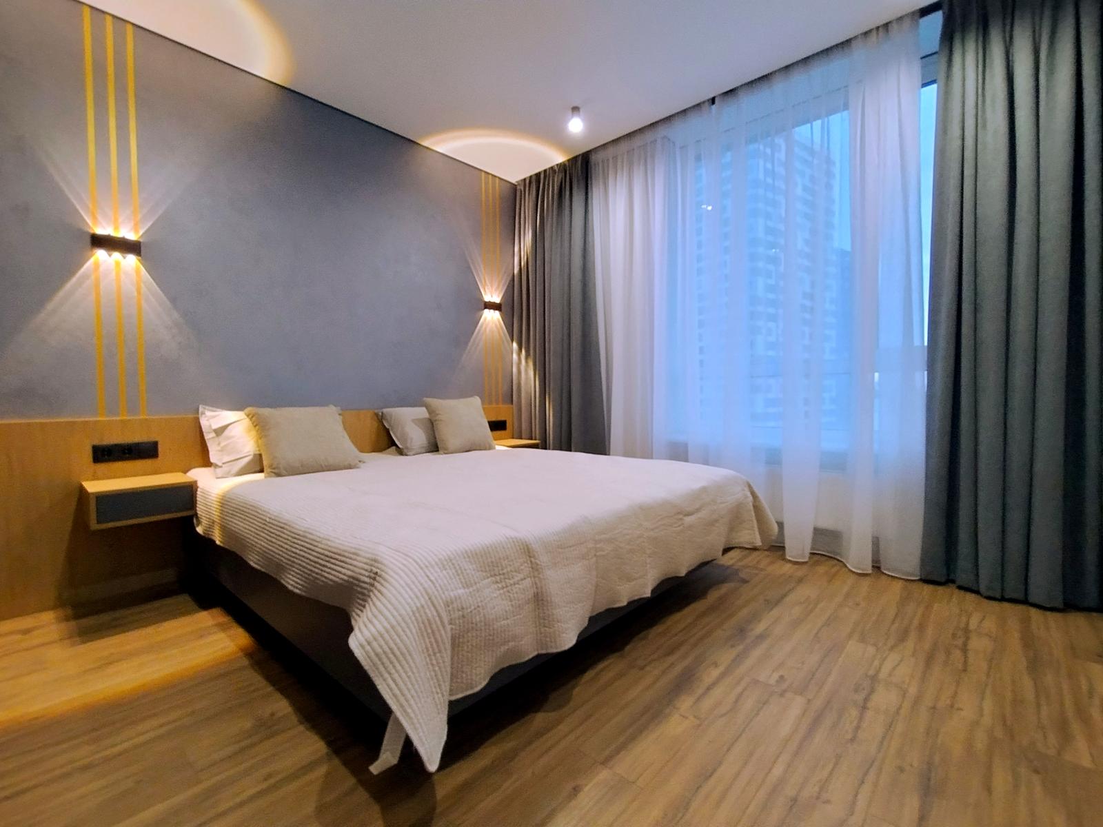 В оселі щойно завершено стильний дизайнерський ремонт 2026 року з використанням високоякісних матеріалів. Підлога встелена вологостійким ламінатом та керамічною плиткою, стіни оздоблені декоративною штукатуркою, а натяжна стеля доповнена сучасними світловими рішеннями: магнітним трековим освітленням у студії, точковим у кімнатах, а також декоративними підсвітками меблів і стелі з інтегрованою нічною підсвіткою на датчиках руху. Квартира повністю укомплектована вбудованими меблями з преміальною фурнітурою та всією необхідною побутовою технікою бренду BOSH, телевізором Samsung та чотирма кондиціонерами для кожної зони. Особливий комфорт забезпечують два повноцінні санвузли — один із ванною, а другий із душовою кабіною.