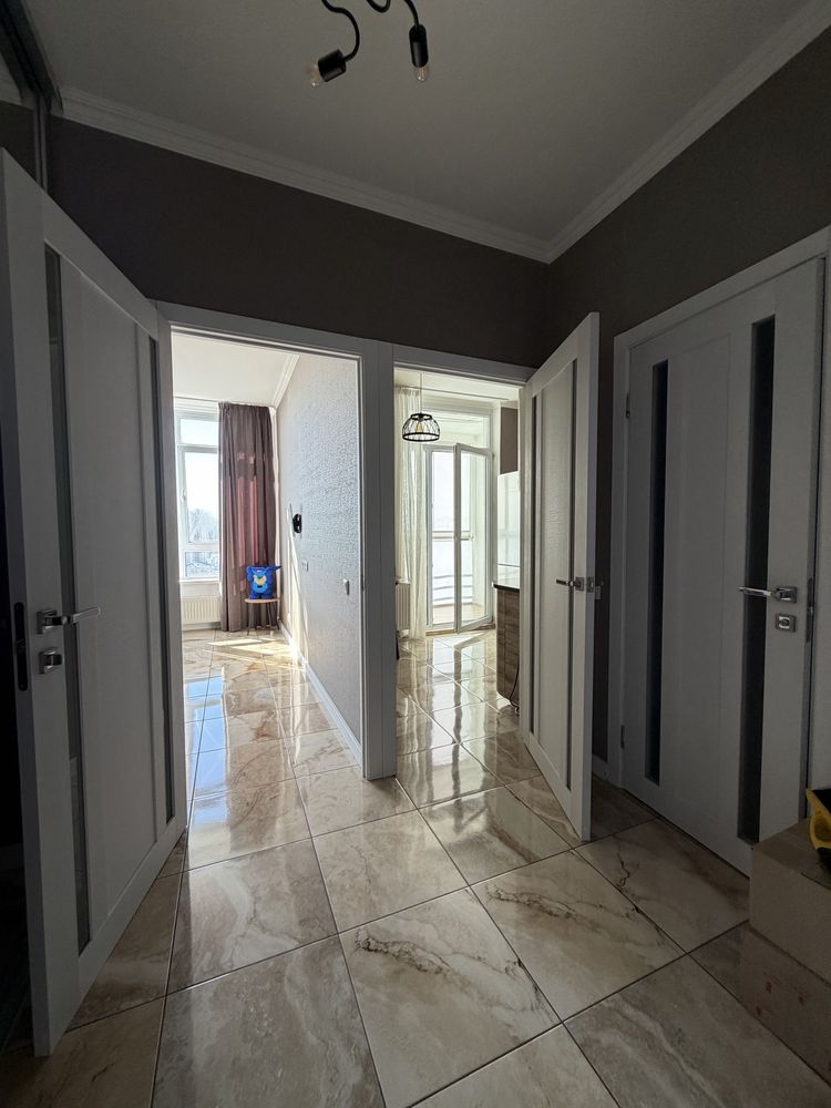 В оселі виконано якісний євроремонт із використанням плитки та ламінату на підлозі, оздобленням стін шпалерами та встановленням сучасних броньованих дверей з італійською фурнітурою. Простір максимально оптимізовано: облаштовано вбудовану кухню, функціональну зону для гардеробу та засклений балкон з утепленою підлогою. Санвузол повністю укомплектований сантехнікою та технікою преміальних брендів, включаючи душову кабіну зі скляною розсувною системою та систему «тепла підлога». Квартира продається майже з повним укомплектуванням, включаючи надійну побутову техніку: пральну машинку, бойлер, кондиціонер, духову шафу, варильну поверхню та витяжку. З вікон, що виходять на південний захід, відкривається чудовий краєвид на Дніпро.