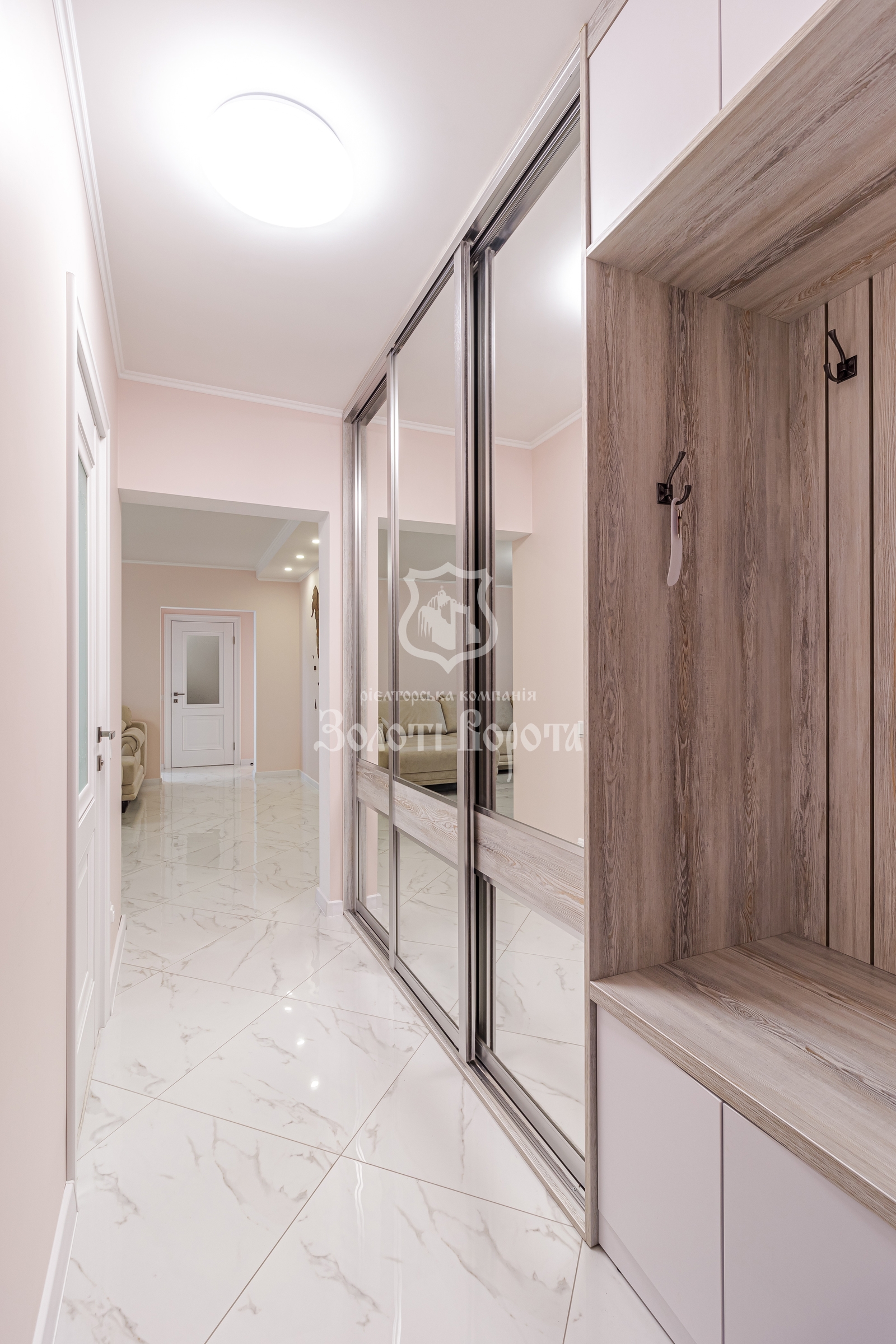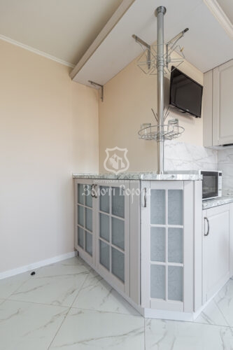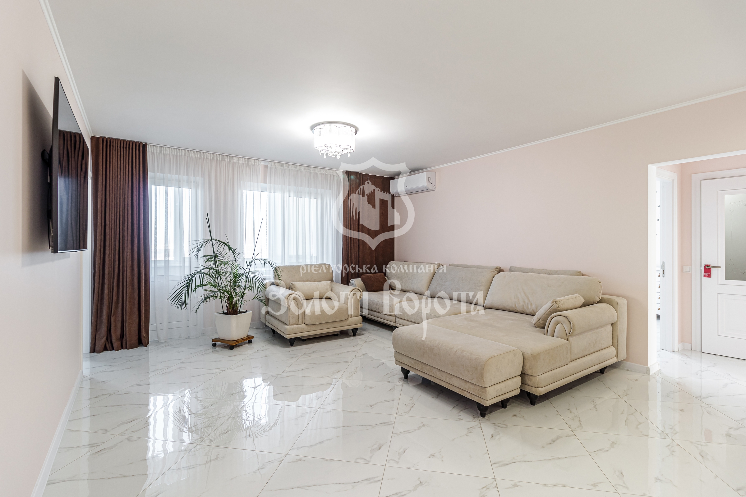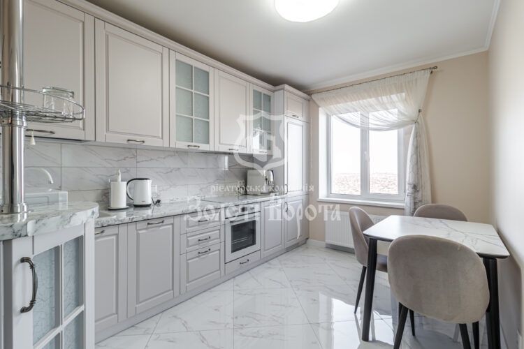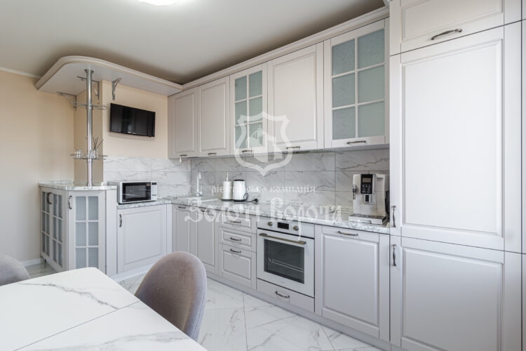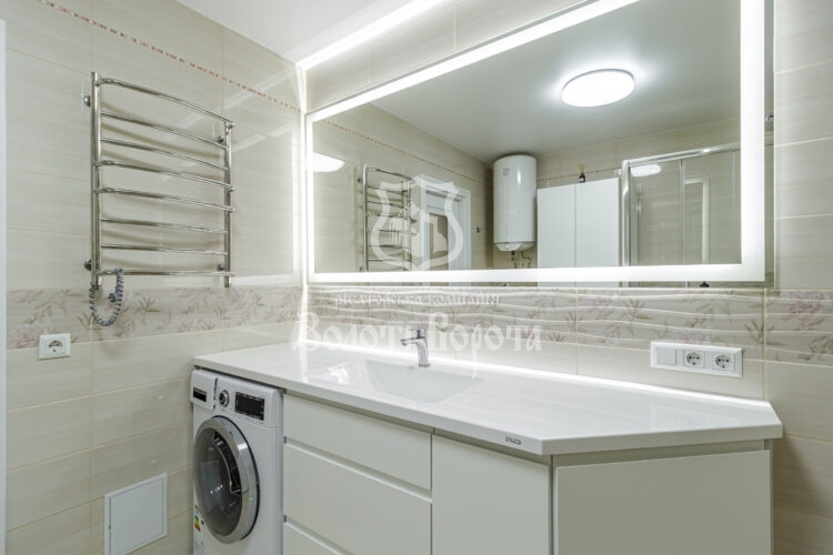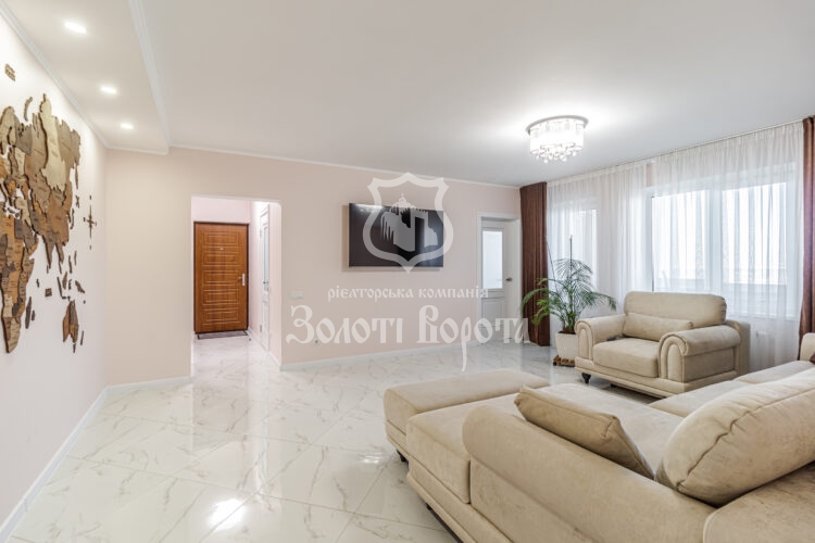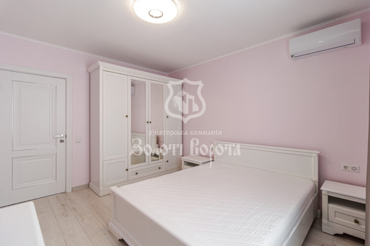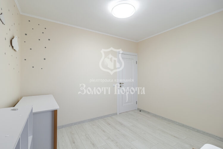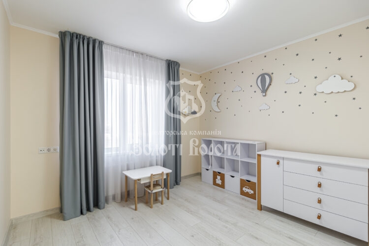 Квартира вирізняється якісним ремонтом та ергономічним плануванням: дві окремі спальні, зокрема облаштована дитяча кімната, містка гардеробна, суміжний санвузол із теплою підлогою та простора вітальня з великим диваном-трансформером.