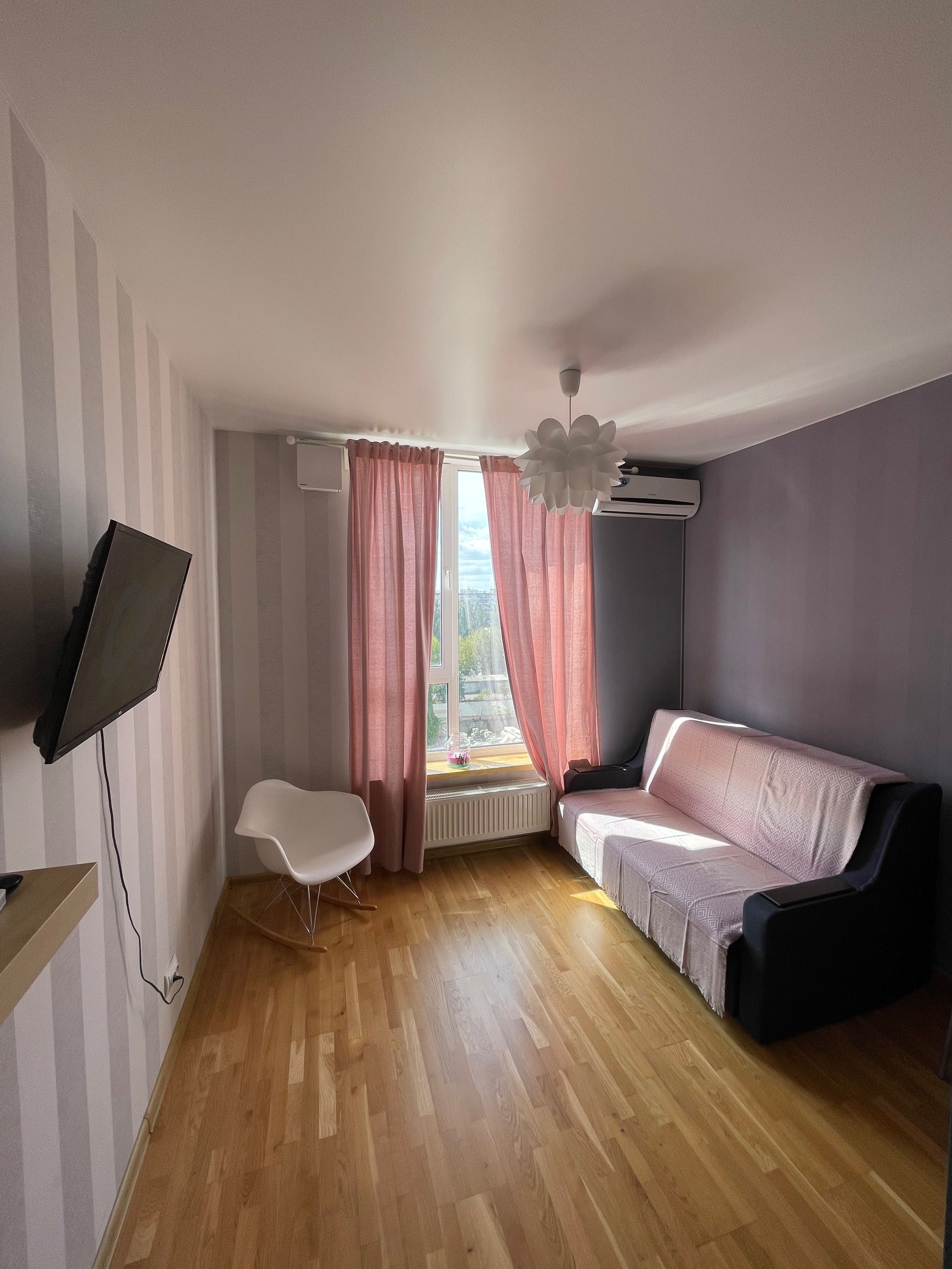 Пропонується до продажу простора однокімнатна квартира загальною площею 60 м2, розташована на 27 поверсі 34-поверхового будинку в житловому комплексі «Мега Сіті» за адресою Харківське шосе, 19А, у Дніпровському районі.