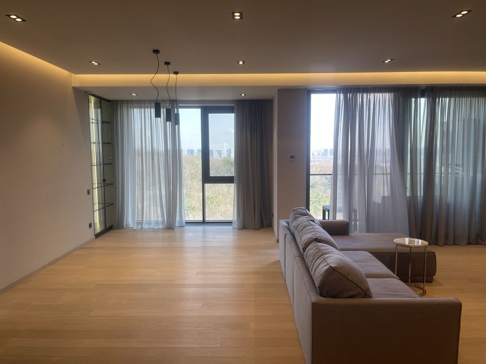 Цей об’єкт площею 190 м² розташований на 8-му поверсі елітного клубного будинку The Garden (2018 року побудови), зведеного за індивідуальним архітектурним проектом з використанням монолітно-каркасної технології та панорамного скління. Квартира вирізняється досконалим плануванням VIP-рівня: простора вітальня з виходом на власну терасу, три майстер-спальні, три гардеробні кімнати та три санвузли забезпечують абсолютну приватність для кожного члена родини. Інтер’єр виконано за авторським дизайнерським проектом із використанням натурального паркету, систем підігріву підлоги та преміальної техніки (посудомийна, сушильна машини, вбудована кавомашина). Оскільки це сучасний комплекс преміум-класу, він повністю обладнаний безпечними електроплитами, а власна система автономного живлення гарантує роботу ліфтів, водопостачання та швидкісного інтернету навіть під час загальних відключень світла. У вартість об’єкта вже включено два машиномісця у підземному паркінгу з прямим доступом до ліфта.