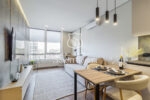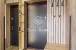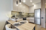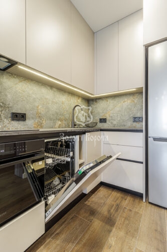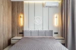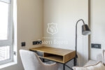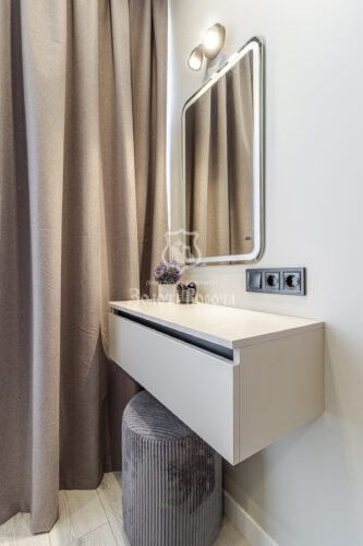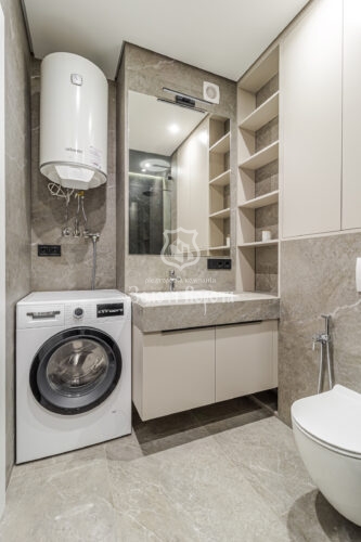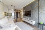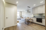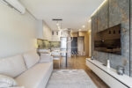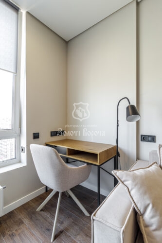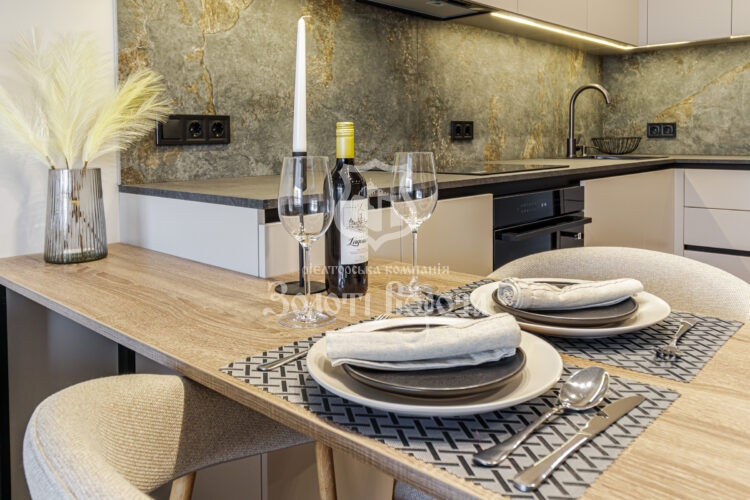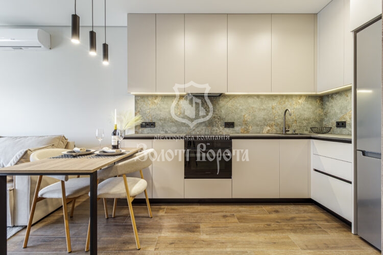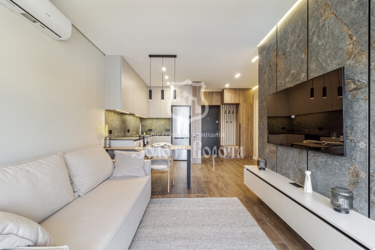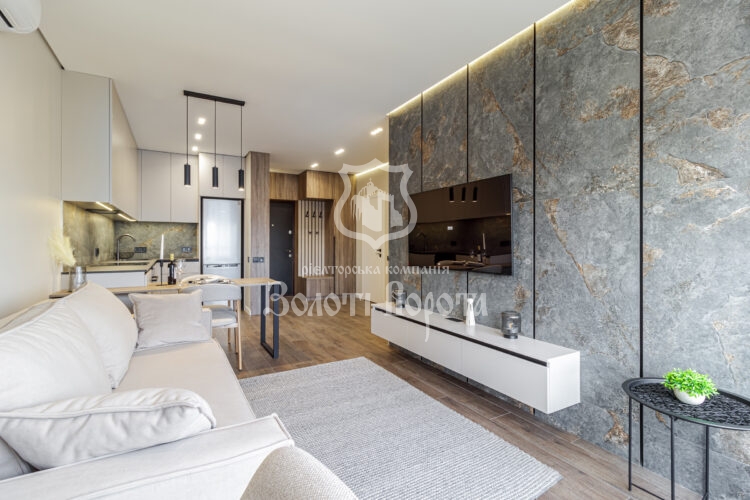 Помешкання оздоблене у сучасному мінімалістичному стилі з використанням дорогих матеріалів та грамотним зонуванням простору. Інтер’єр витриманий у спокійних бежево-сірих тонах із акцентами на натуральних текстурах дерева та каменю. Планування передбачає затишну кухню-вітальню, що об’єднана в єдину living-зону з обідньою групою, та окрему повноцінну спальню з великою шафою та великою кількістю природного світла.