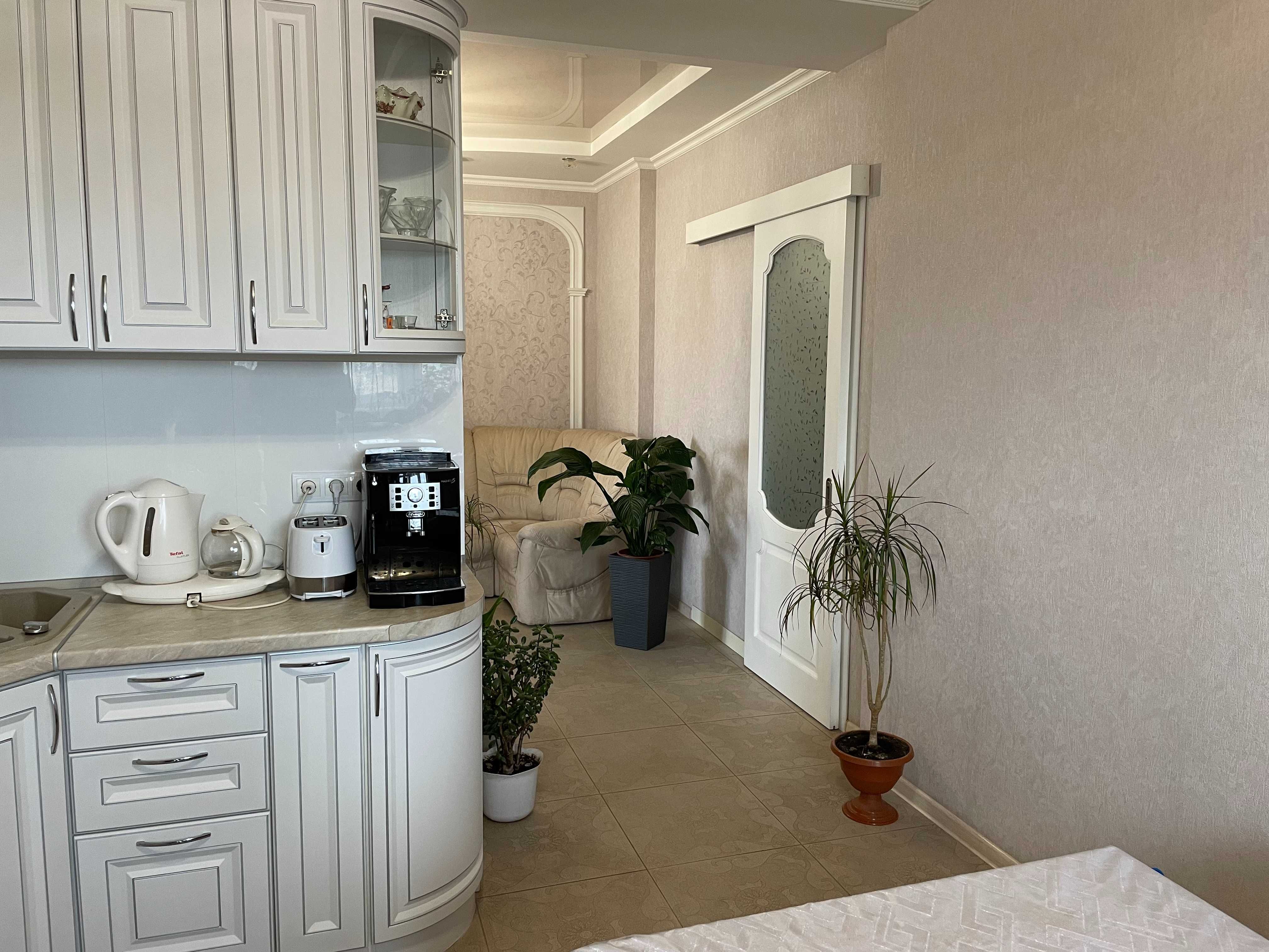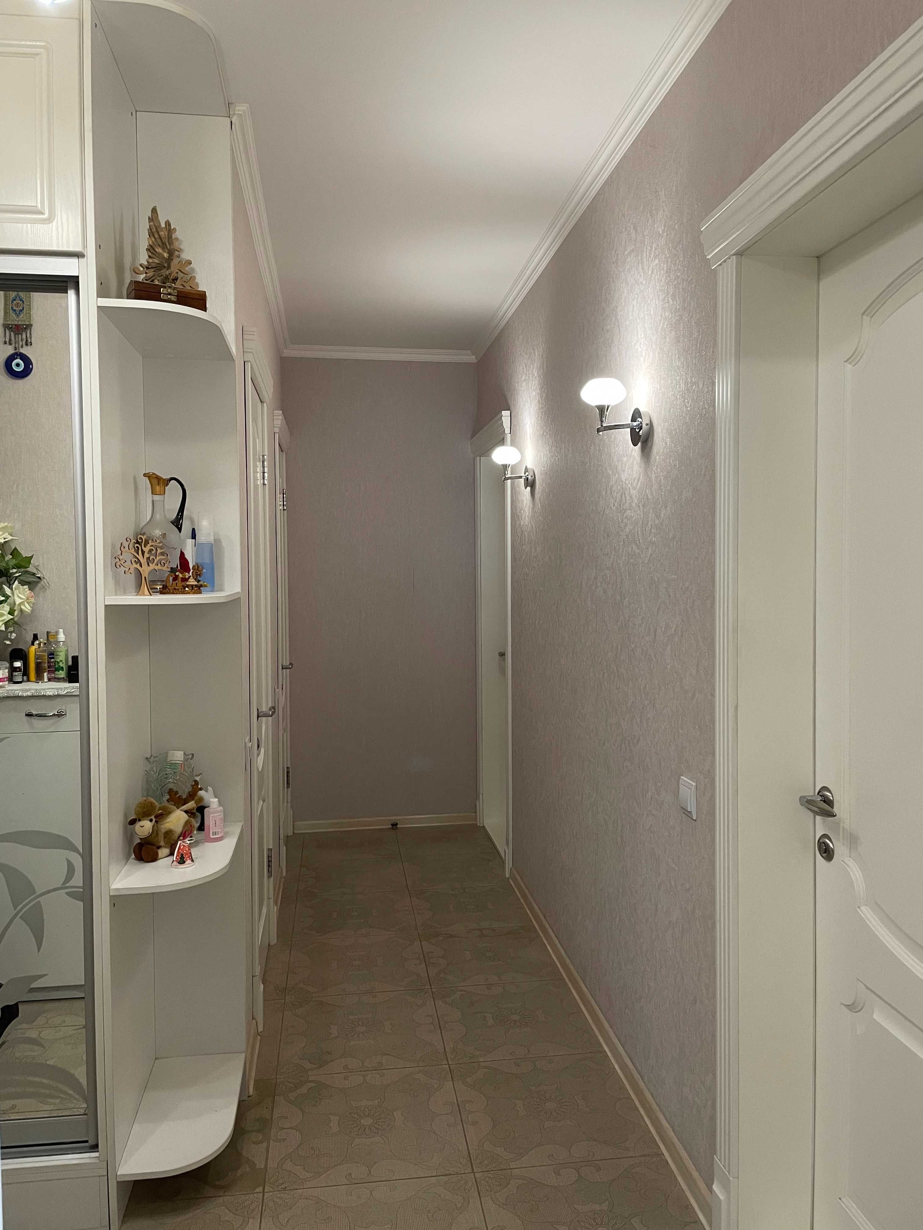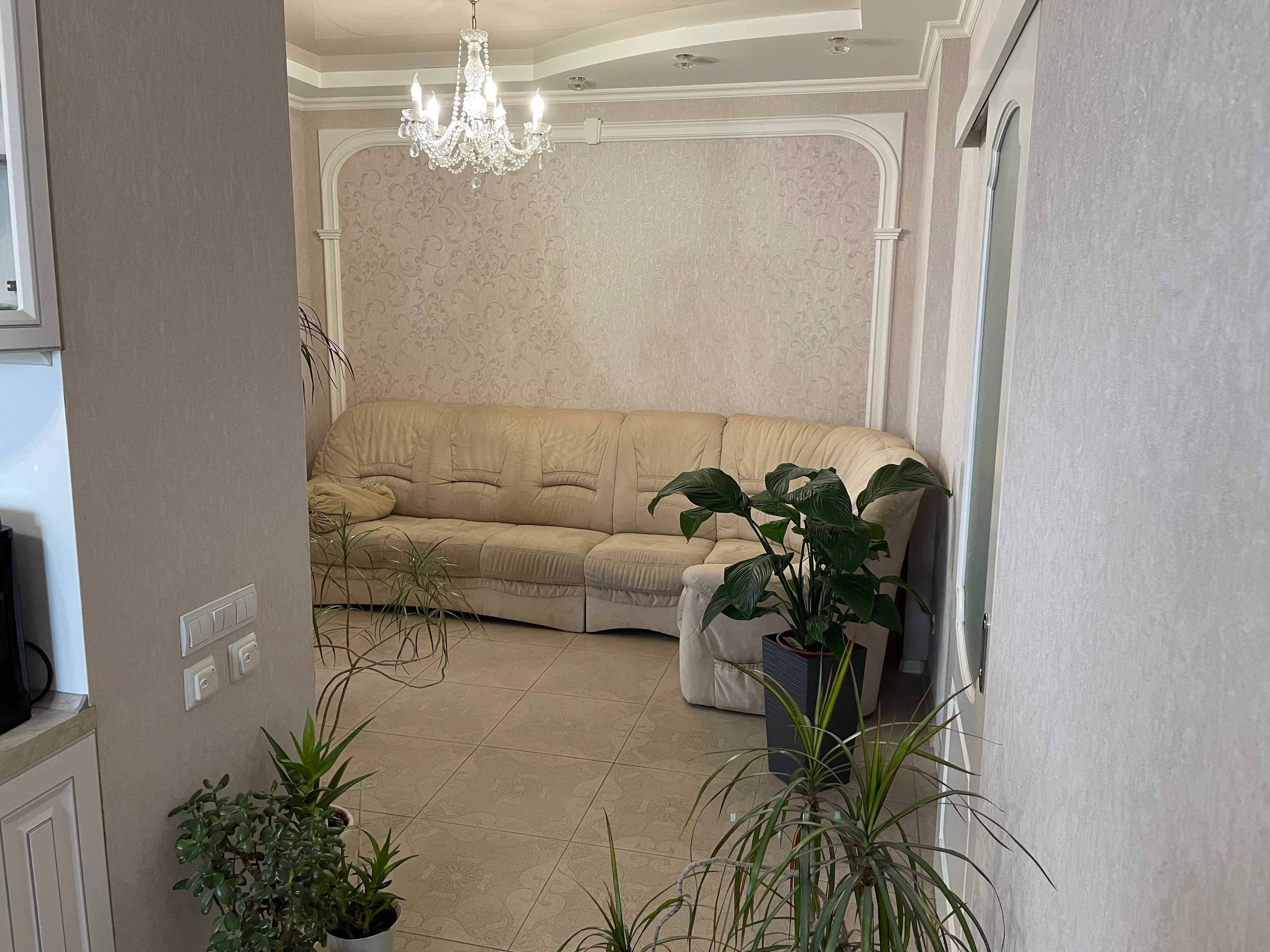 Квартира має функціональне планування: окремі кімнати, простора кухня та зони для відпочинку. За фото видно виконаний якісний ремонт у класичному стилі з використанням світлих тонів, декоративних елементів та продуманого освітлення.