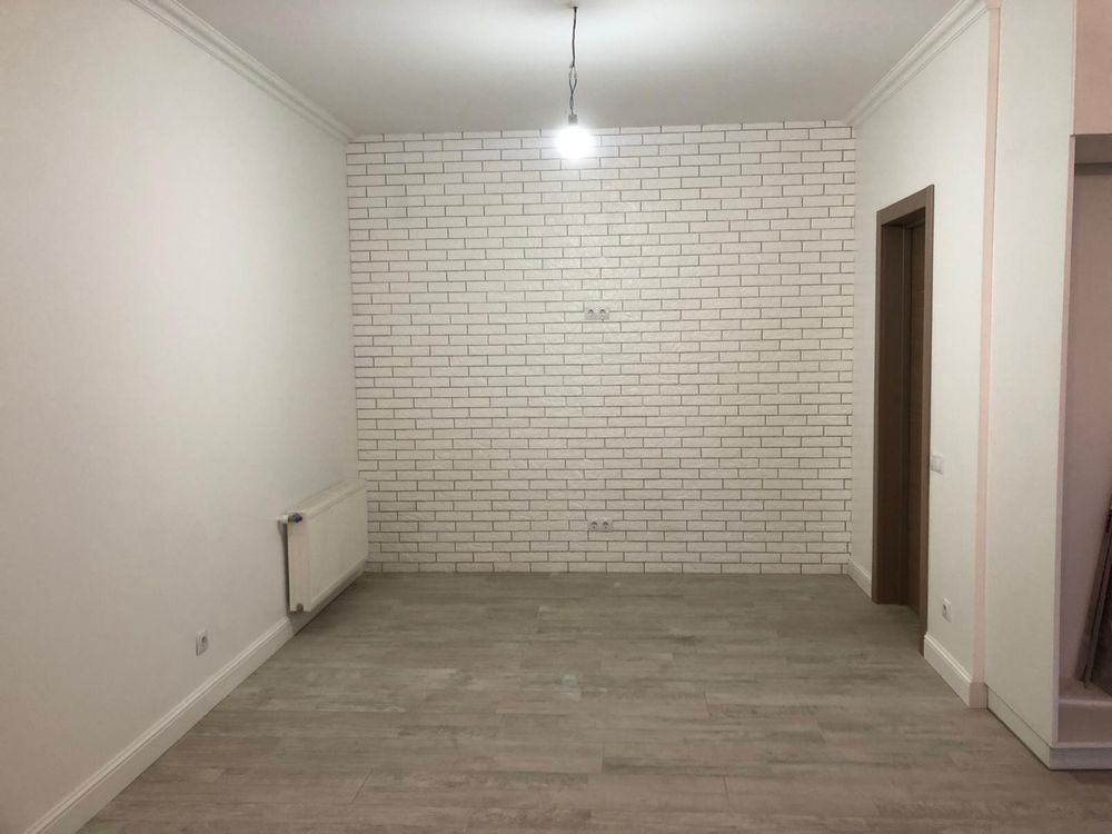 У вітальні вже виконано стильний ремонт: нове фарбування, підлога викладена «ялинкою», встановлені металопластикові вікна, нові батареї та кондиціонер Cooper&Hunter з режимами охолодження та обігріву.