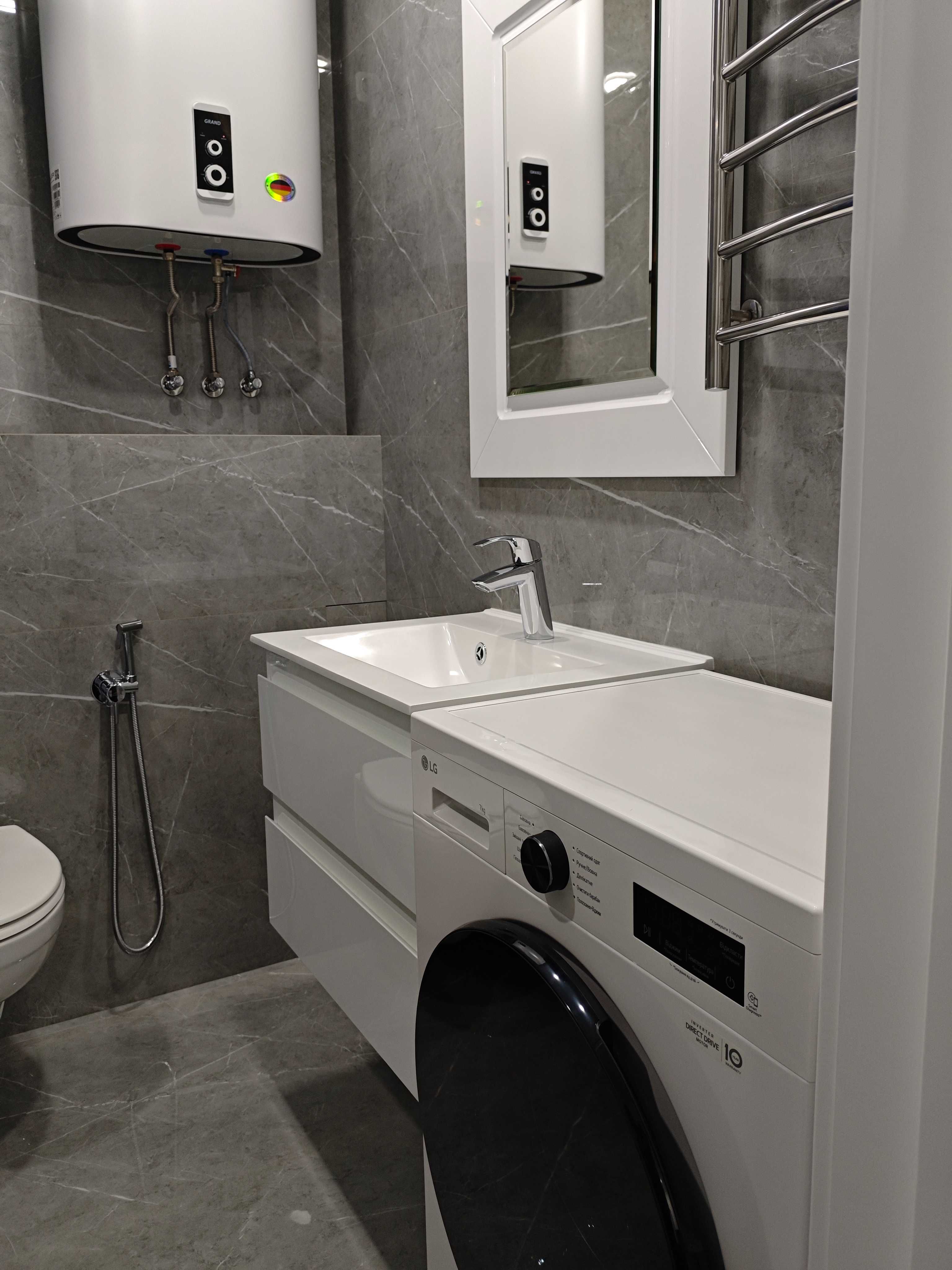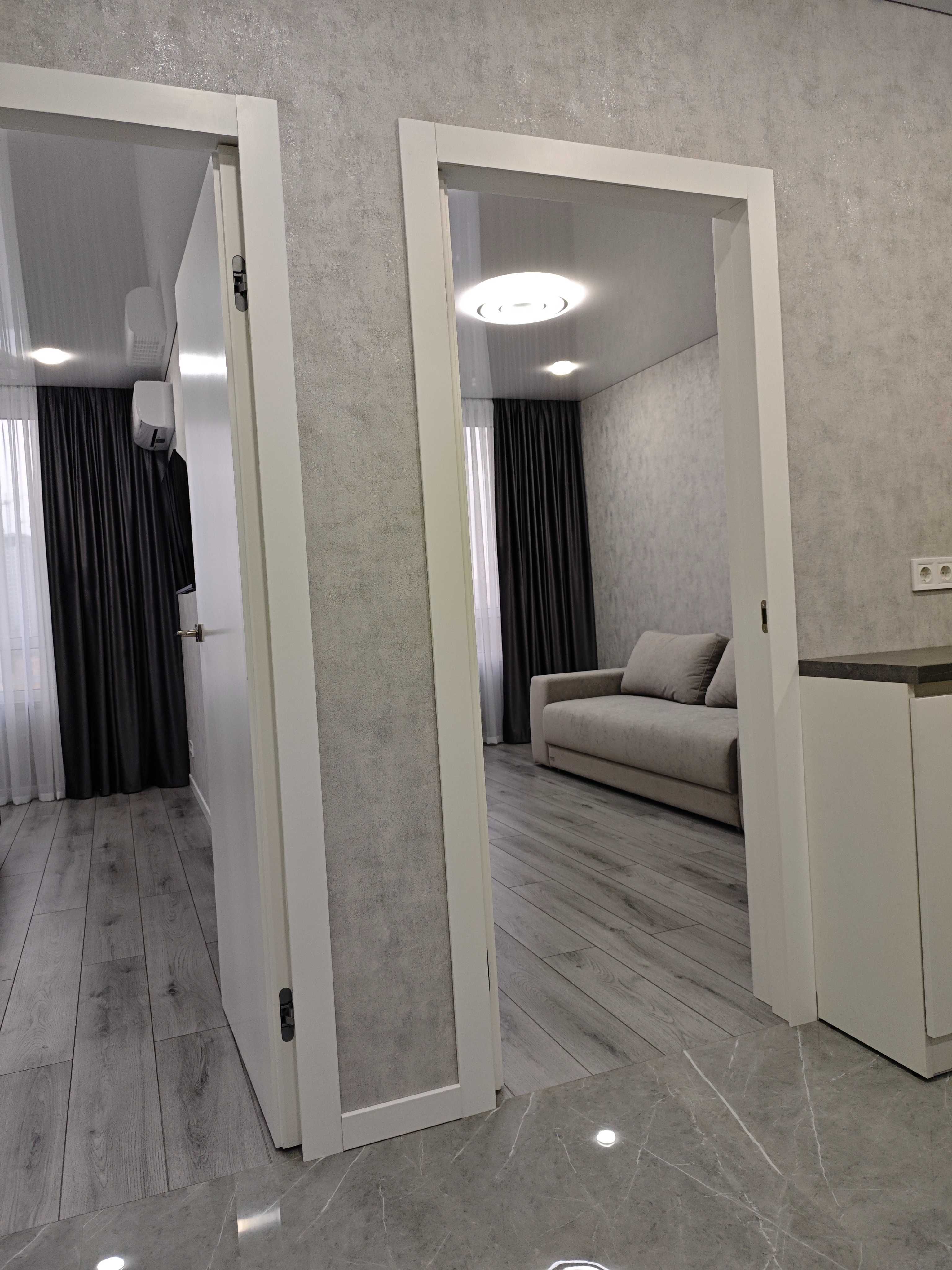 У квартирі виконаний якісний сучасний ремонт із використанням європейських матеріалів: іспанська та німецька сантехніка, змішувач Grohe, унітаз Kolo, керамограніт, німецький ламінат і шпалери, компланарні двері. Натяжна стеля з тіньовим профілем додає сучасного стилю.