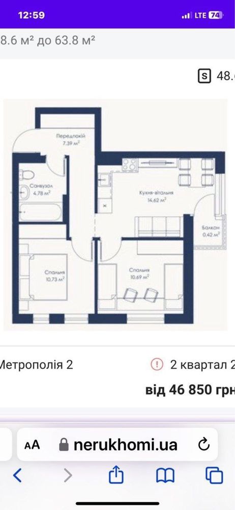 18 поверх із 26. Загальна площа — 50 м². Продумане планування: дві окремі кімнати, кухня, санвузол. Квартира світла, простора та з гарним видом.