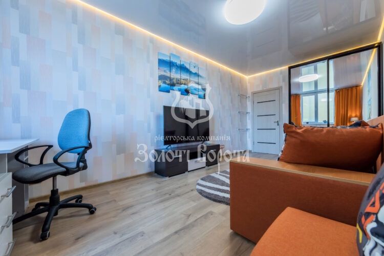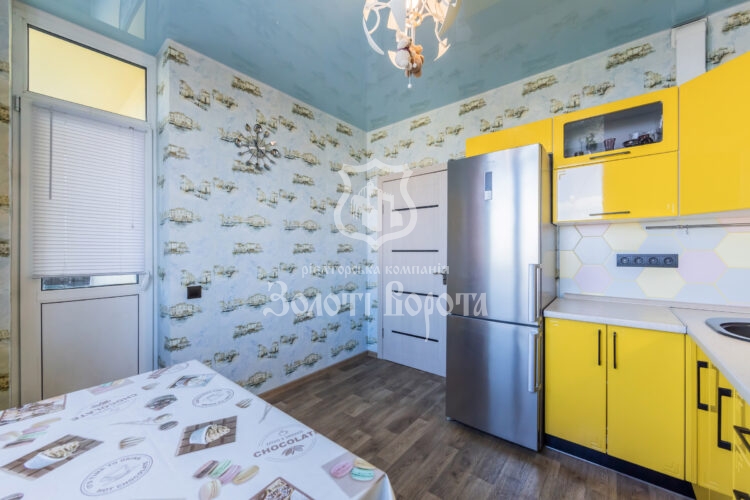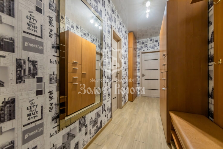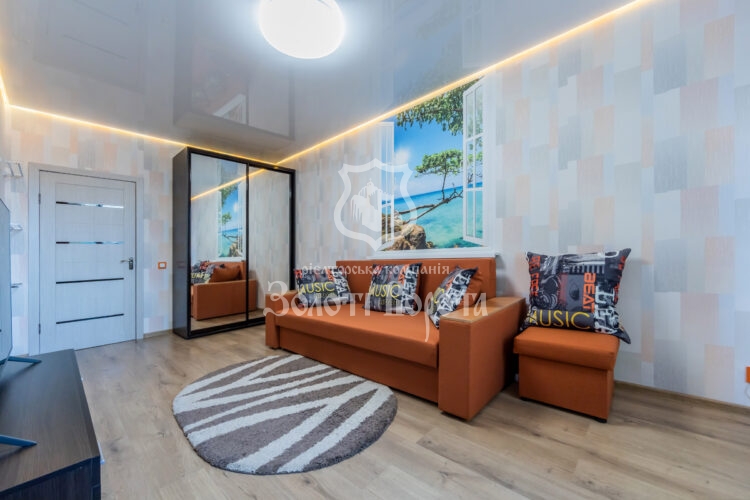 Функціональність інтер’єру підкреслюється великою кількістю місць для зберігання: у коридорі розміщено три місткі шафи, а в кімнаті — велика шафа-купе з дзеркальними дверима. Житлова зона облаштована зручним диваном для відпочинку, а наявність заскленої лоджії збільшує корисний простір квартири. Кухня та санвузол у бездоганному стані й повністю готові до користування.