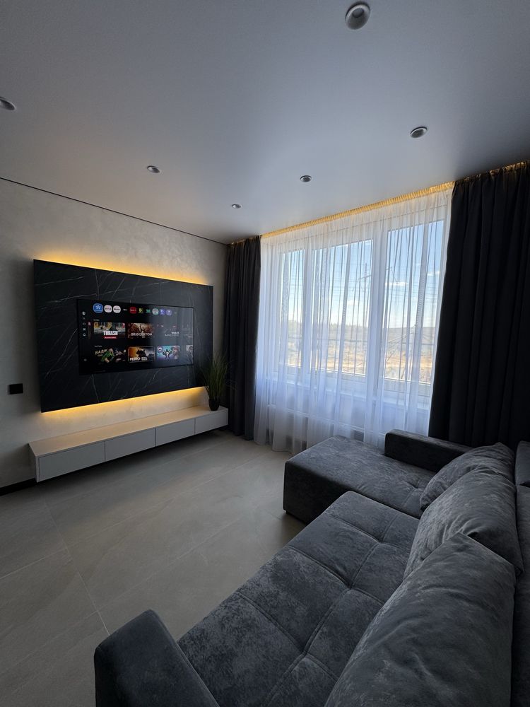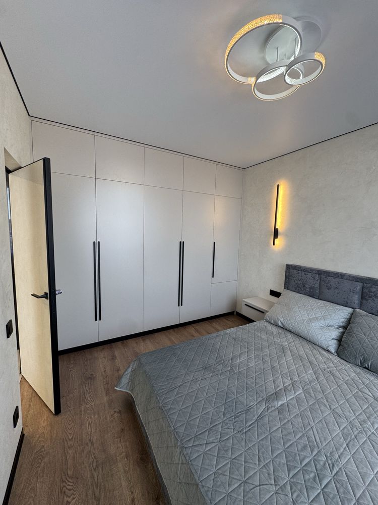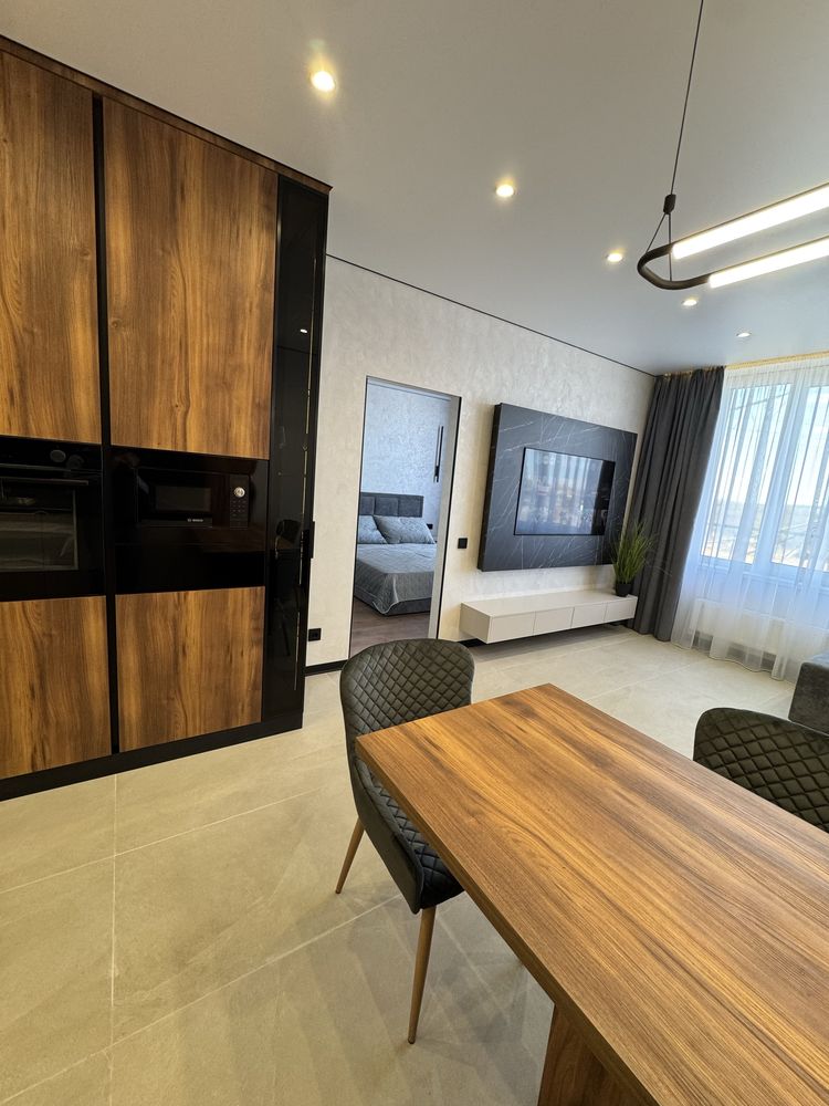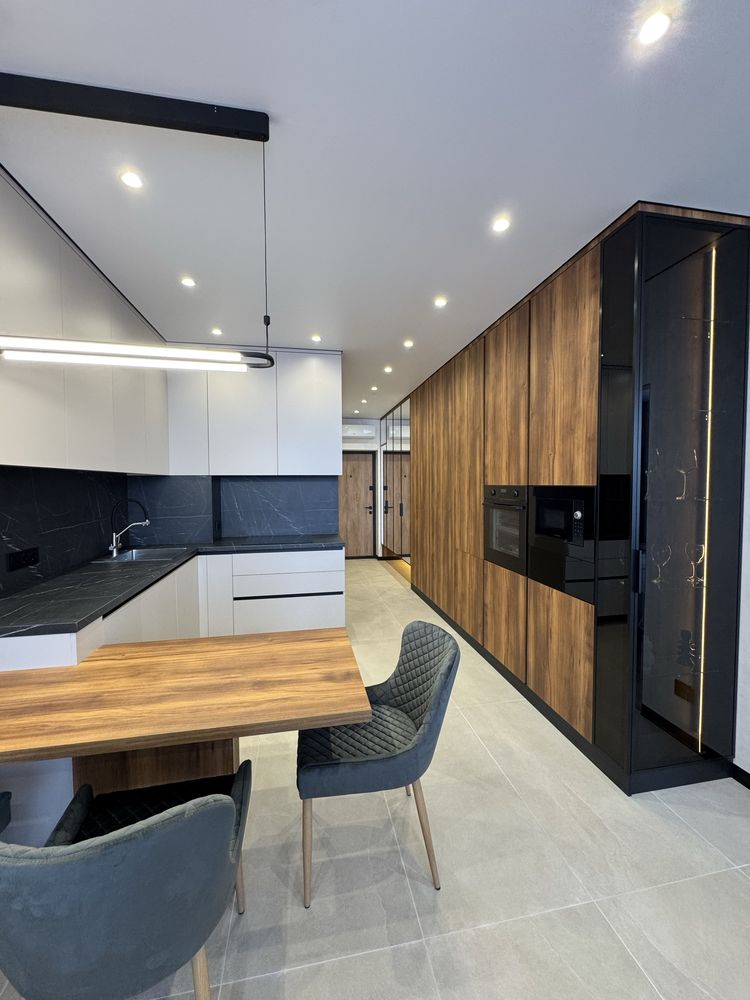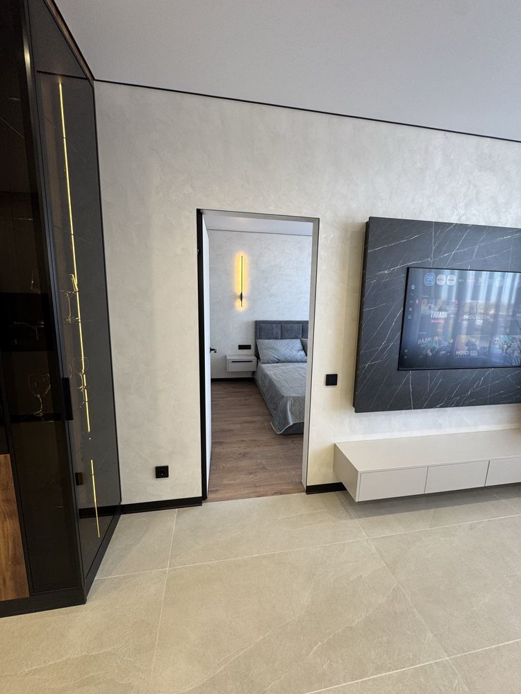 Квартира з дизайнерським ремонтом, виконаним із якісних матеріалів: декоративна штукатурка, тепла підлога у ванній, коридорі та кухні, продумане багаторівневе освітлення. Повністю укомплектована меблями та технікою: двоспальне ліжко з підйомним механізмом, шафи, кухня з обідньою зоною та диваном. Встановлено фільтрацію води та систему осмосу, пральну та сушильну машини, посудомийну машину, кондиціонер, холодильник, індукційну плиту, духову шафу та мікрохвильову піч. Будинок оснащений генератором — працюють ліфти та опалення під час відключень світла.